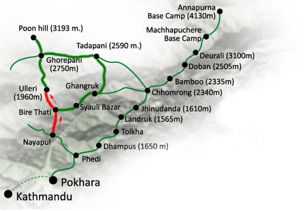 Annapurna Comfort Trekking -14 Days, technically starts with a brief sightseeing of the major UNESCO World Heritage Sites in Kathmandu(1200) before making a journey to Pokhara(800m) by plane or bus. Pokhara is a town endowed with beautiful natural lakes like Phewa Lake, Begnas Lake, Rupa Lake and so forth. There is nothing like enjoying the breathtaking reflection of Mount Machhapuchhre in Phewa Lake while boating in it. Proceeding forth, the trail then winds through Deurali (2149m), Jhinudada (1750m) Chhomrong(2040m), Ghandruk (1770m), Tadapani (2720m), Ghorepani (3210m), Tikhedhunga (1480m) en route to Pokhara (800m), where the trekking formally ends.