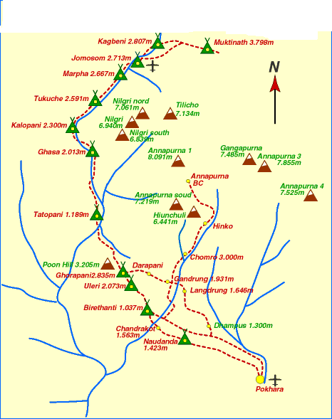 Kali Gandaki- Ghorepani Poon Hill Trek- 16 Days technically starts with a brief sigtseeing of the UNESCO World Heritage Sites in Kathmandu valley (1400m) prior to a bus drive or a flight to a Pokhara (800m) the following day. En route to Ghorepani (2750m), the trail winds through Nayapul (1070m) and Tikhedunga (1577). Ghorepani is associated with a legend : the ancient traders found water (pani) for their horse (ghoda) here, which eventually led to nomenclature– Ghorepani. At the dawn an ascend to Poon Hill (3193m) offers the profoundly surrealistic view of sunrise and enigmatic pink glow landed on Dhaulagiri and Tukuche Peak. Thereafter, the trail continues to Sikha (1920m),Tatopani (1179m),Ghasa (2013m), Larnung (2543m), Marpha (2676m), Kaligandaki(2520m), Muktinath (3802m), Jomsom (2713m), then flight to Pokhara where the trekking ends.