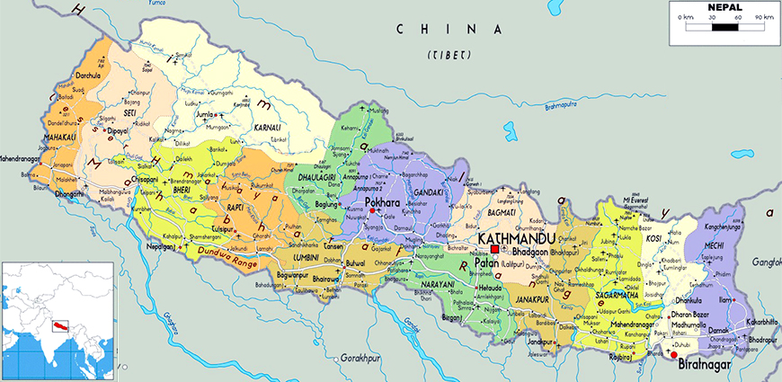 Nepal is roughly trapezodal country in terms of its shape, whose lenth is 800km, and breath is 200km with an area of 1,47,181km2. Nepal is tropographically divided into three categories , which are commonly known as Mountainour Region, Hilly Region and Terail Region. These regions are horizontally divided from East to West, by an imaginary line that intersects with the vertically flowing major rivers of Nepal : The Koshi, The Naryani, The Karnali and their other tirburatories. The southern lowland plains that stretches till the border are the norhtern rim of what is called Indo-Gangetic plains. The outermost range of fotthilss called are situated at 700 to 1000 metres that puts a demarcation of the Gangetic Plain. The mounatainous regions have made global reputation for adventure activities like Mountain Expeditions, Trekkings and tours. The hilly region of Nepal is climatically moderate and this region is a powerhouse for a wide range of flora and fauna. In addition, the hilly region of Nepal stores even the most endangered species of wildlife in the world. Nepal, presently known as the Federal Democratic Republic of Nepal, is a landlocked coutry which is bordered to the North by People's republic of China and to the South, West and East by India.
