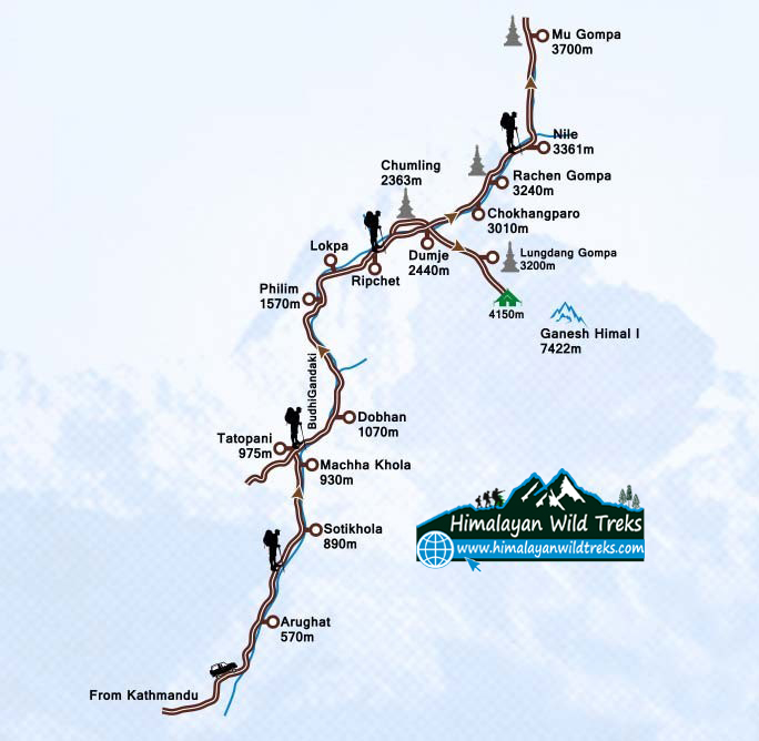 Tsum Valley Trekking– 19 Days, technically starts with a brief sightseeing of the major UNESCO World Heritage Sites in Kathmandu(1400m) prior to drive to Arughat Bazar(561m) from where we drive to Soti Khola(710m), en route to Machha Khola (887m), Dobhan(876m), Philim (634m), Chhokangparo (722m), Chhule (3721m) where we pay a short visit to Milareppa cave and trace back to Mu Gompa (3400m), Rachen Gompa(2943m), Philim (3170m), en route to Tatopani (3210m) Soti Khola (710m) traversing ahead to Arughat (561m), where the trekking formally comes to an end.